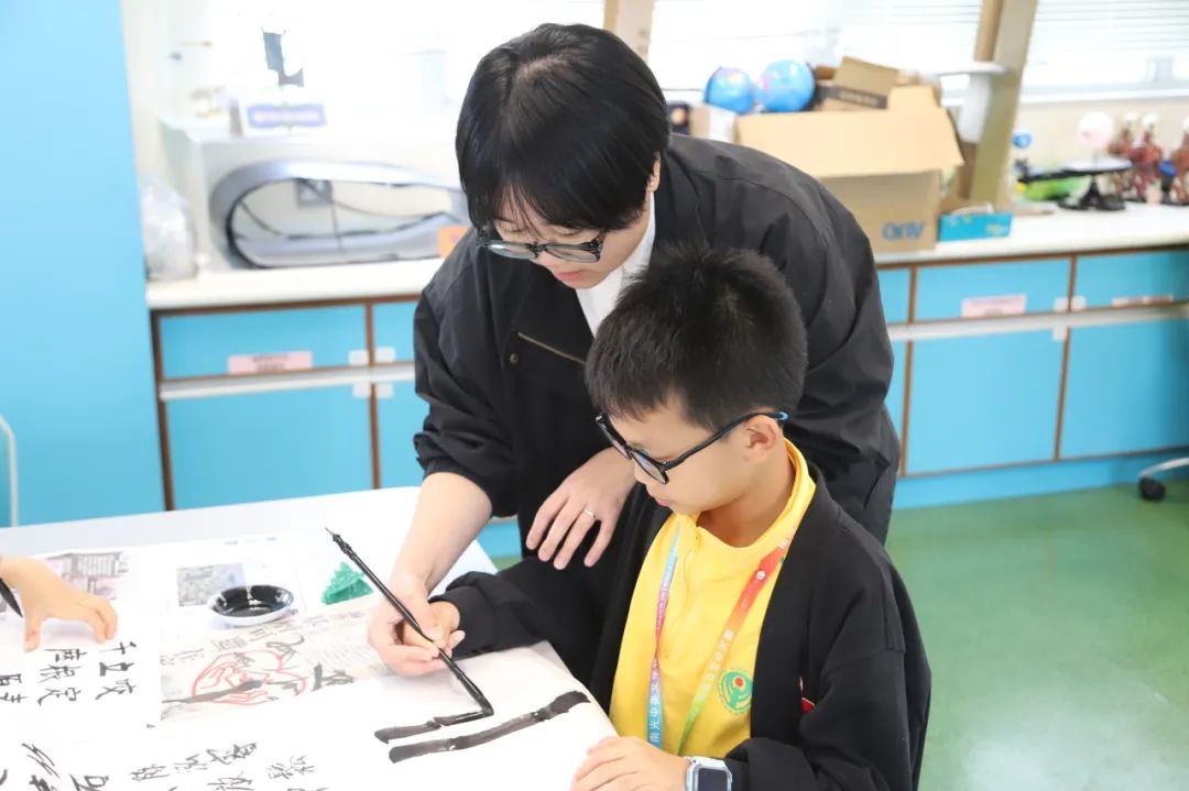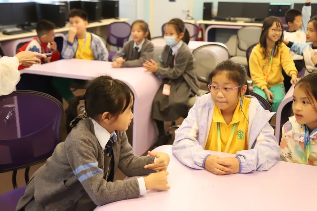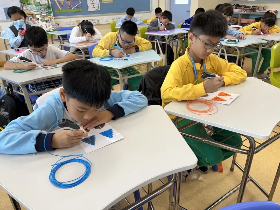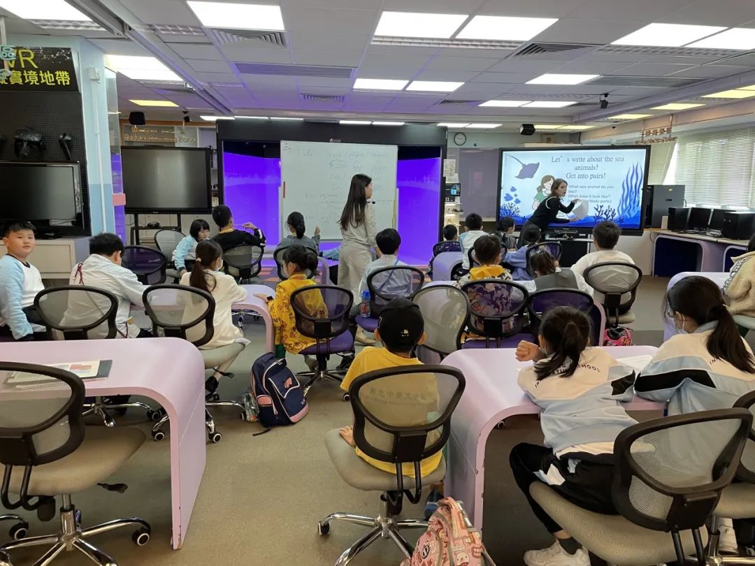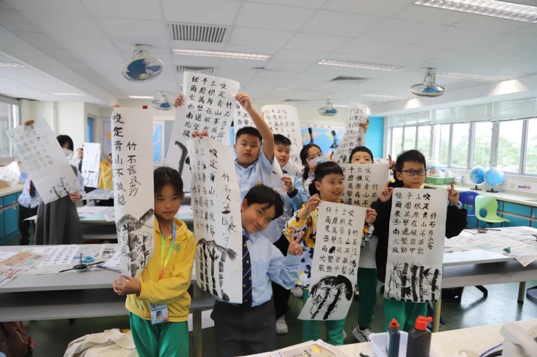 在香港凤溪创新小学,同学们不仅参观了校园,感受了不一样的校园文化,而且还与凤溪创新小学的学生一起上课,体验了不一样的上课模式,感受了不一样的课程内容。中文课上,同学们以诗人郑夑的《竹石》为主题,临摹名人书法,再配以自画竹,形成了一幅题画诗;英文课上,老师以Ocean为主题,采取全英课堂的教学模式,通过先进的VR设备,让同学们沉浸式地体验和了解了海洋生物的特性;此外,同学们还上了一节饶有趣味的视艺课——使用3D打印笔设计了一颗立体圣诞树。