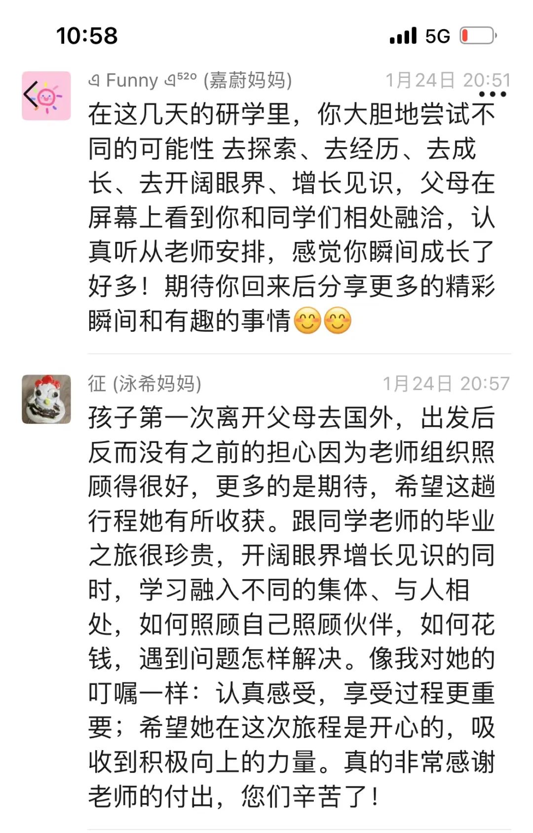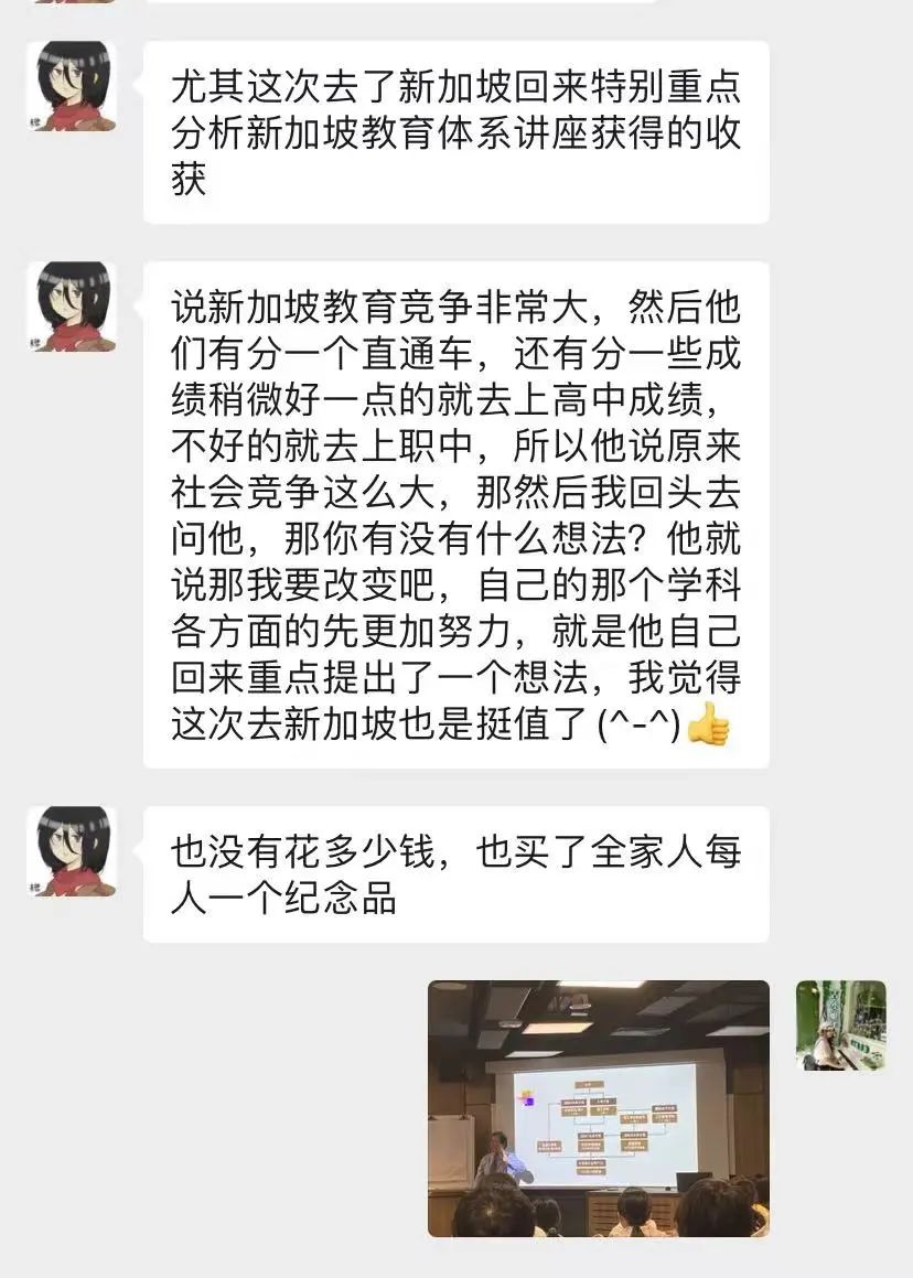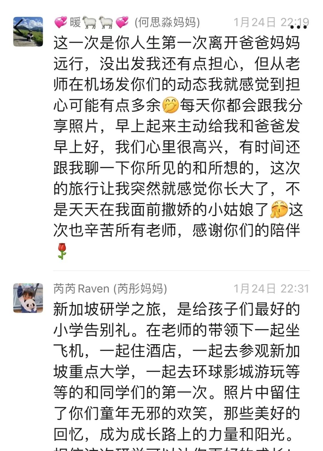 “走出国门,让精彩的世界影响你!”这是家长们看到孩子在新加坡研学活动中寄予的厚望和最多的感慨。他们不仅非常支持孩子们参加这次研学活动,还特别感谢我们学校团队的组织和安排。这次活动让孩子们度过了一个难忘的研学之旅,相信这次研学活动会对孩子们的成长和发展产生积极的影响,让他们在今后的学习和生活中更加有动力,憧憬美好的未来。
