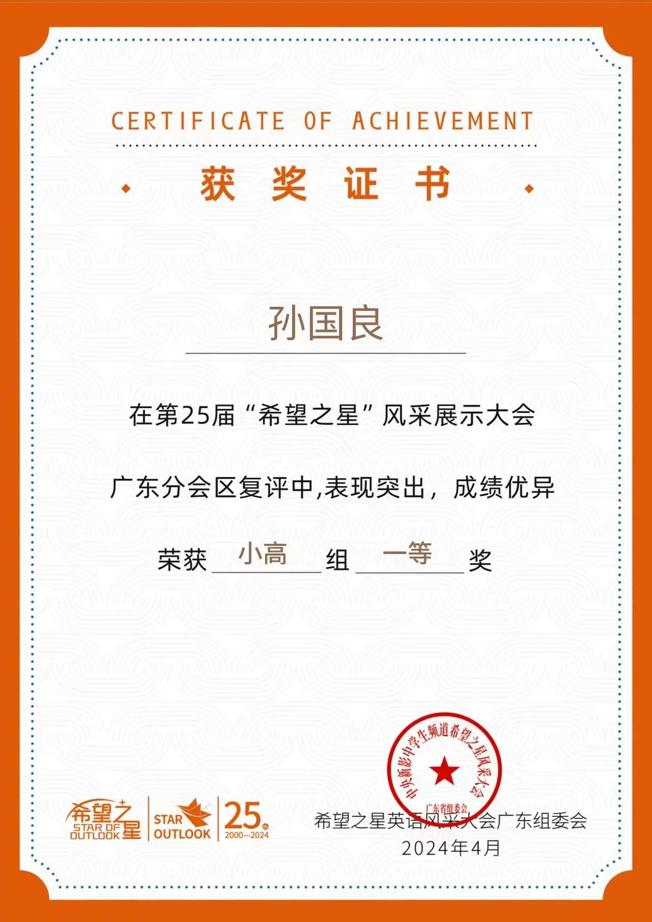 皇天不负苦心人,我的辛勤付出也获得了回报。我学习成绩优异,曾经多次被评为“三好学生”,通过了“GESE”口语六级考试;在体育方面,我曾在武术和击剑比赛中获得一等奖、二等奖、团体一等奖等奖项,曾在校运会中获得跳远二等奖。